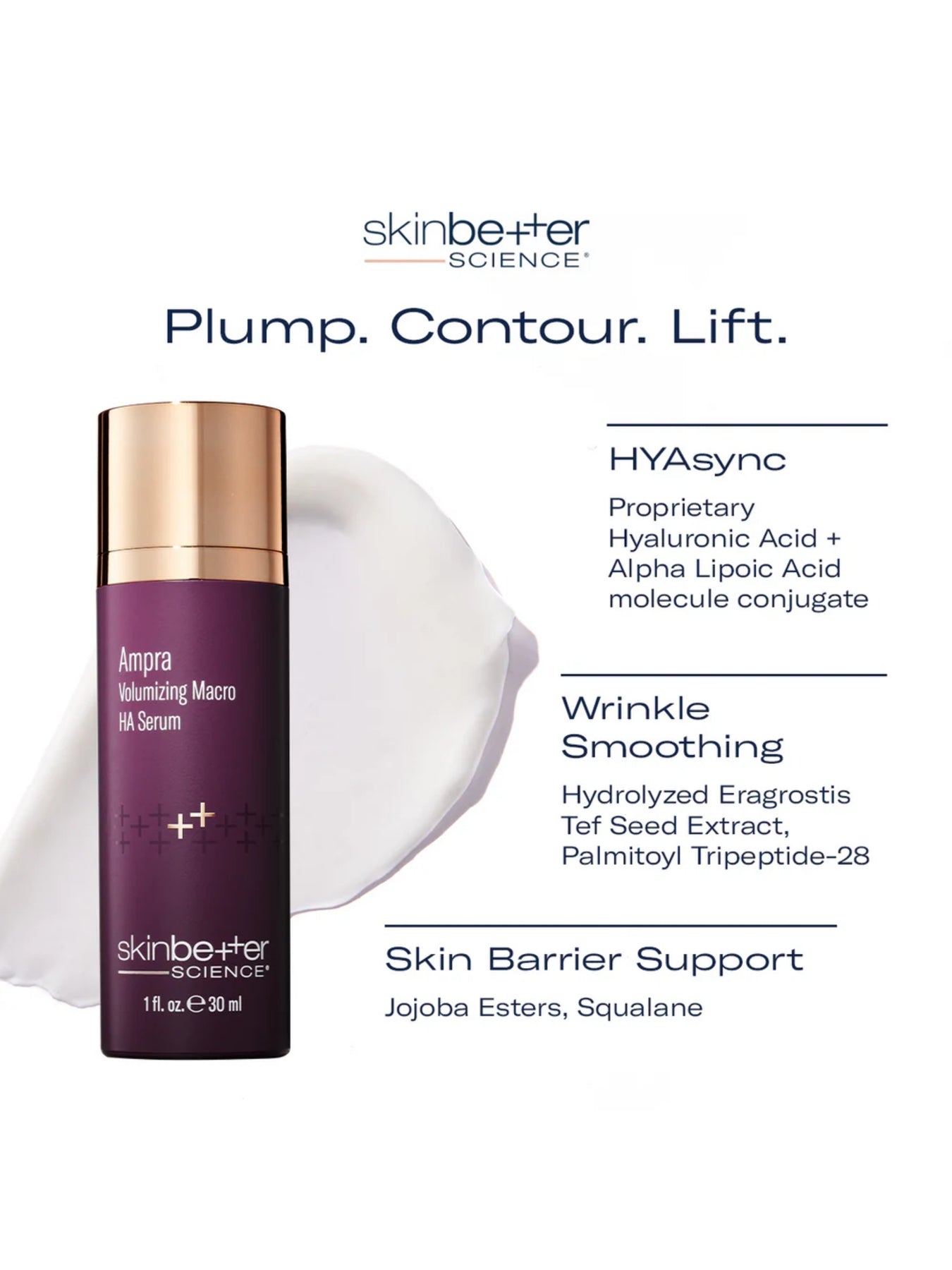 Plump, contour, and lift. Ampra Volumizing Macro HA Serum, powered by proprietary HYAsync technology, delivers hyaluronic acid conjugated with alpha-lipoic acid to restore the appearance of fullness, redefine contours, and improve skin texture and radiance. This innovative hyaluronic acid serum helps deliver HA and protect it from breakdown, sustaining its presence and activity. With continued use, the skin appears plumper, smoother, and more radiant, reducing the appearance of fine lines and visibly redefining contours.